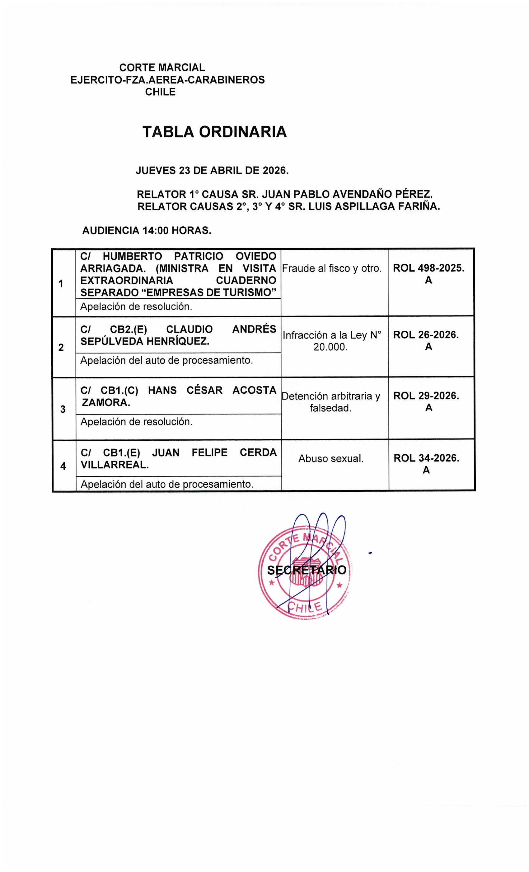 Tabla ordinaria jueves 23 de abril del 2026