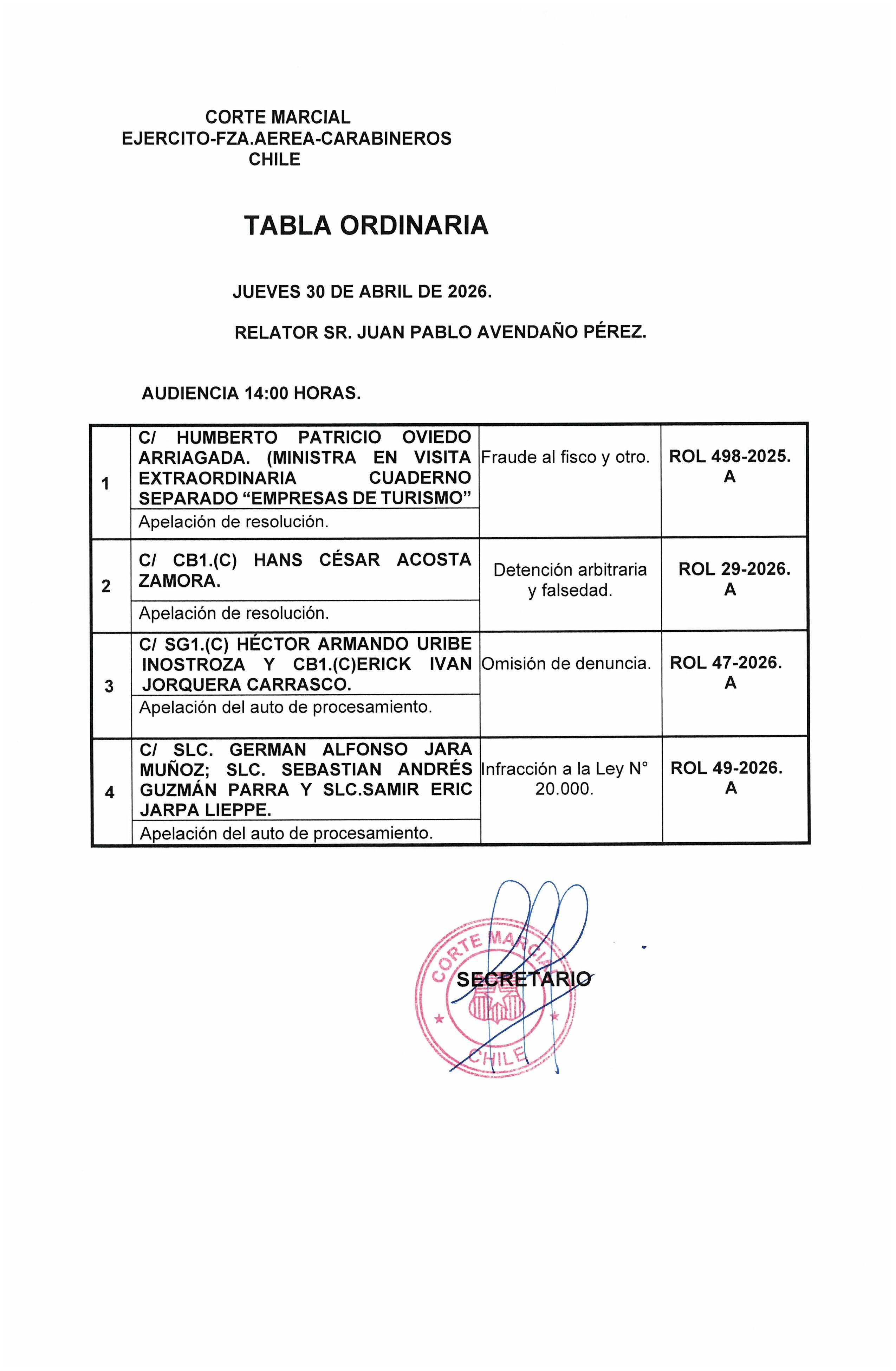 Tabla ordinaria jueves 30 de abril de 2026