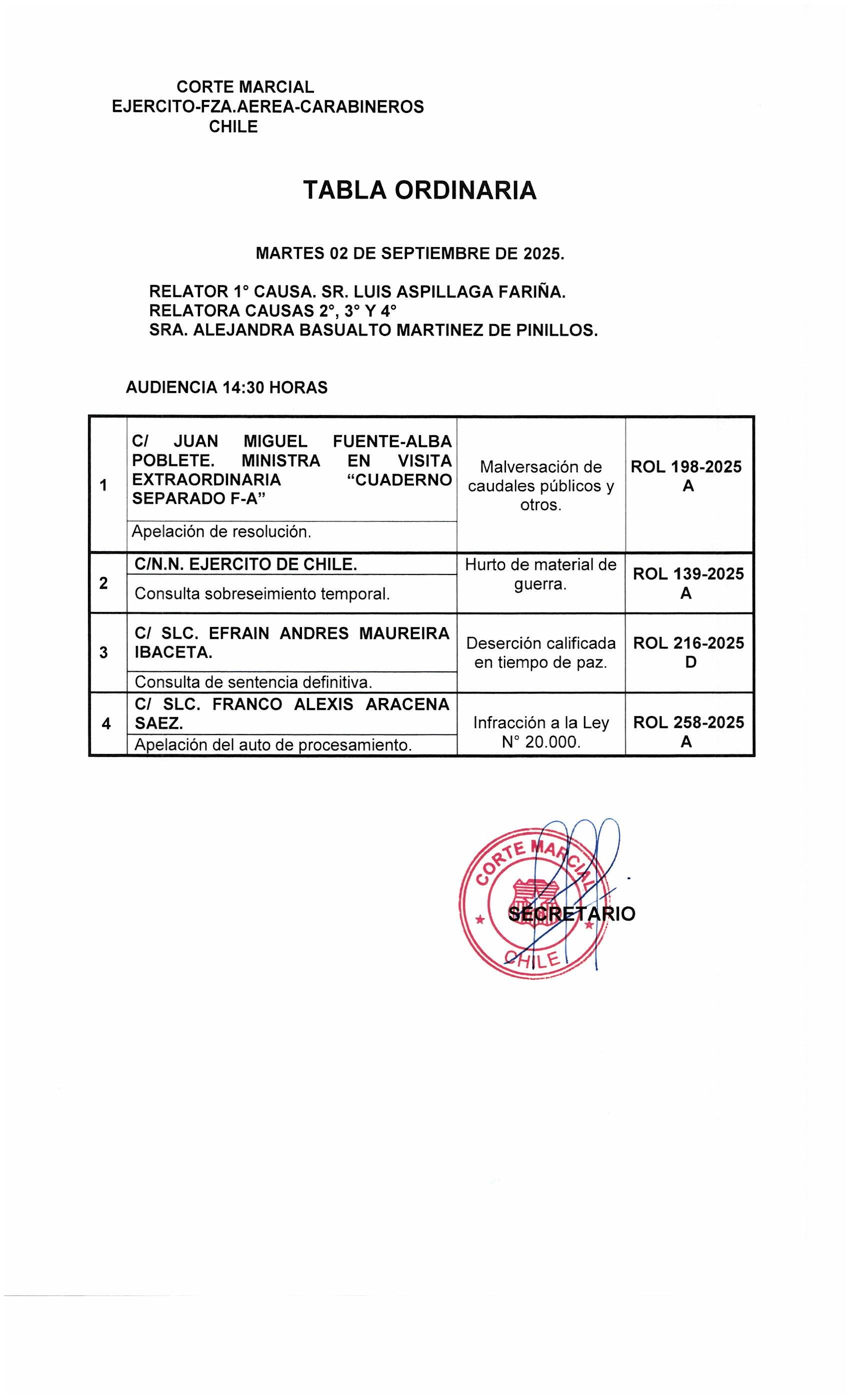 Tabla ordinaria martes 02 de septiembre del 2025