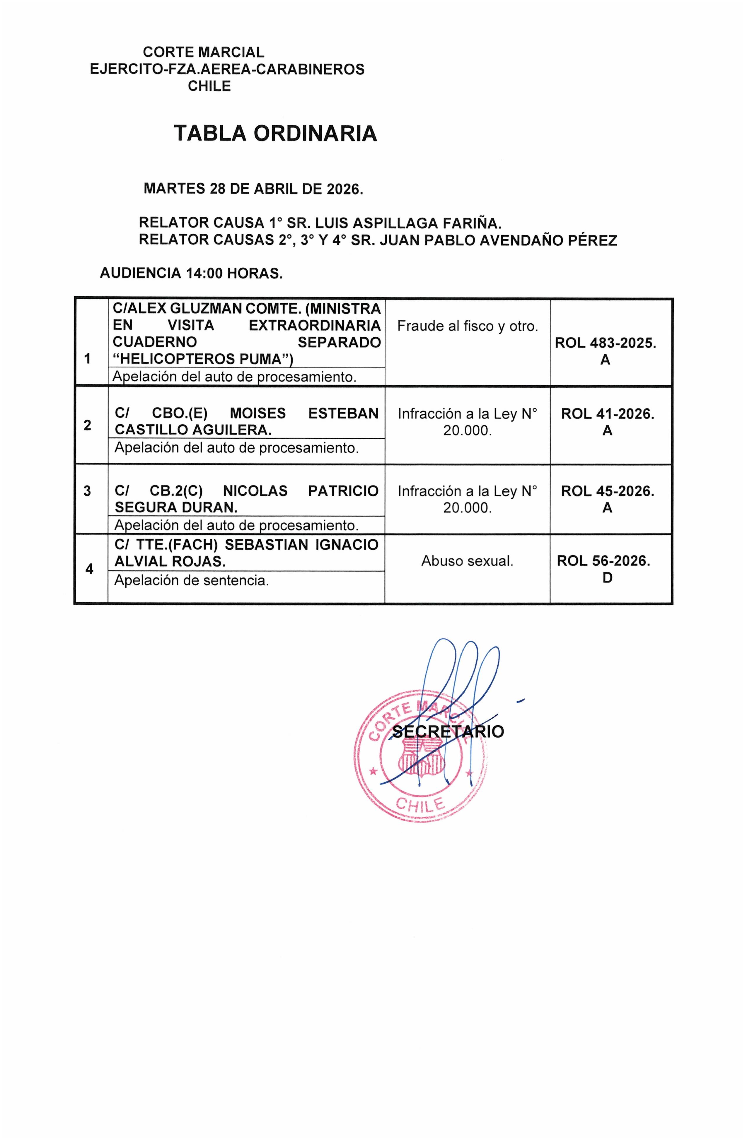 Tabla ordinaria martes 28 de abril de 2026